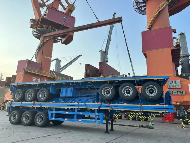 Flatbed Trailer is versatile and sturdy, perfect for carrying various cargo types. It offers easy access from all sides.