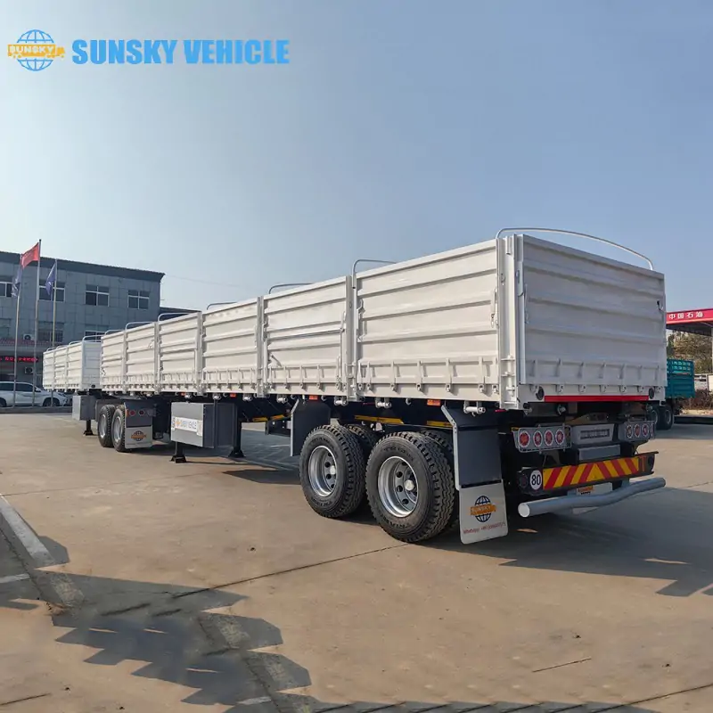 The dropside feature of our trailer adds another layer of functionality, making it easy to load and unload various types of cargo. The sidewalls are 1200mm high with a 3mm thickness and are of the durable Henred type, complete with convenient grain windows. For secure container transport, the trailer is fitted with 4 container locks on the front unit and 12 on the back unit, ensuring your containers are firmly in place during transit. This dual-purpose design makes our superlink trailer an all-in-one solution for both container and bulk cargo logistics.